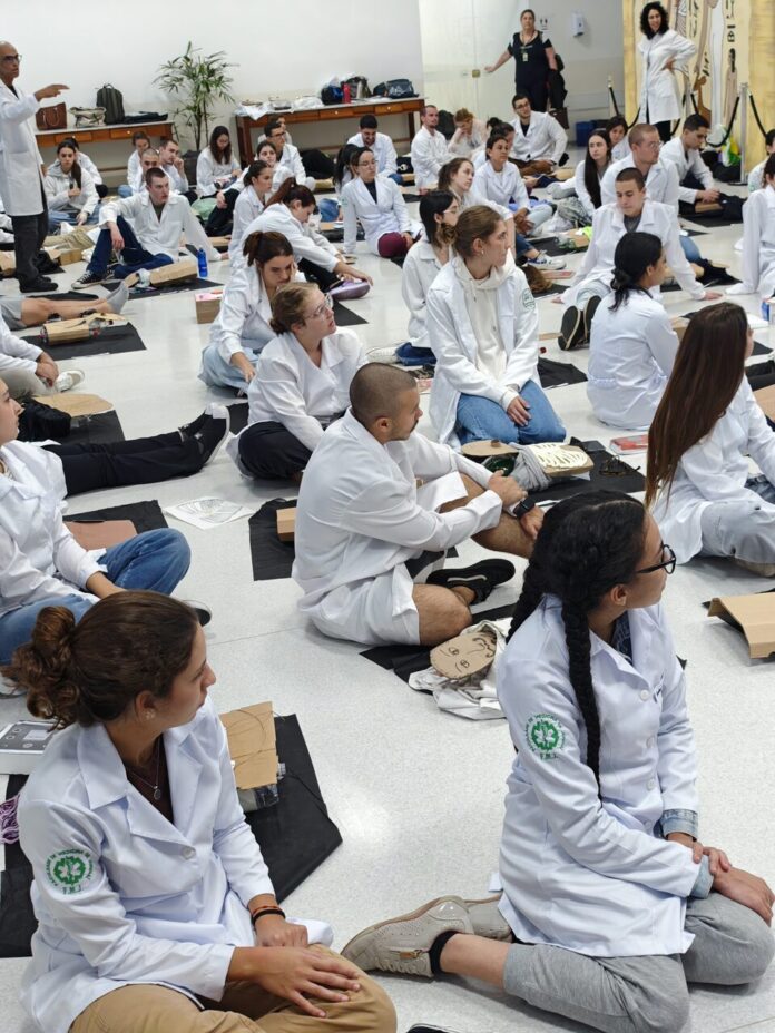Uma atividade inovadora e com impacto no processo de aprendizagem tem se destacado na Faculdade de Medicina de Jundiaí. Na Disciplina de Fundamentos Assistenciais e Noções de Primeiros Socorros, estudantes do 1º ano estão desenvolvendo simuladores artesanais para treinar manobras de Reanimação Cardiopulmonar (RCP), utilizando materiais simples como garrafas PET, papelão e elásticos.
