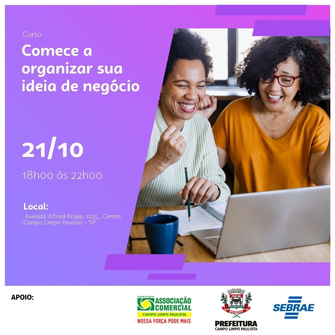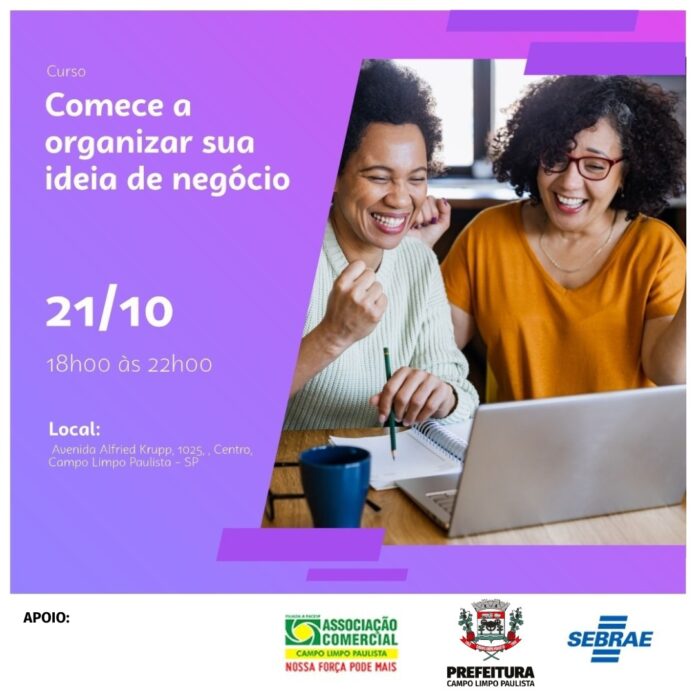A Prefeitura de Campo Limpo Paulista, em parceria com o Sebrae e a Associação Comercial, realiza no dia 21 de outubro, das 18 às 22 horas, o curso “Comece a organizar sua ideia de negócio”, voltado a quem deseja tirar do papel um projeto, abrir uma empresa ou transformar uma boa ideia em oportunidade real.