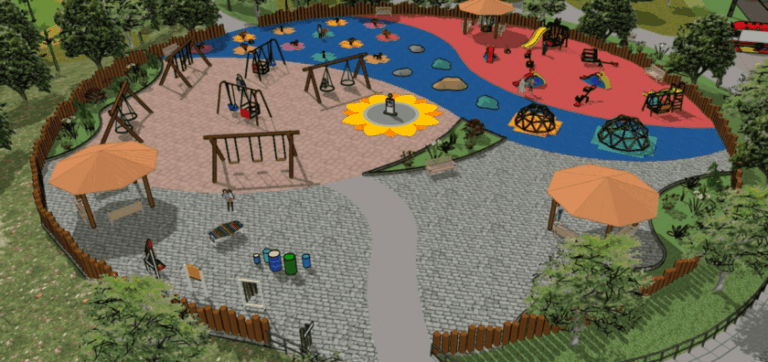 O espaço contará com trilha sensorial tátil e psicomotora, brinquedos sonoros de baixa intensidade com dissipação acústica pela vegetação, caixa de areia com brinquedos de movimento vestibular e psicomotor, jardim olfativo com plantas de cores suaves e aromas não agressivos, área de brinquedos psicomotores com piso emborrachado, brinquedos adaptados para PNE/PCD, brinquedos visuais e de sombra projetada, além de uma Casa de Apoio equipada com enfermaria e banheiros acessíveis e um Espelho d’Água para experiências e estímulos com a água.