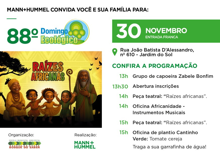 O evento é uma parceria entre a Prefeitura de Indaiatuba e a empresa Mann+hummel, que há 17 anos promove a educação ambiental e cultural e a sustentabilidade na cidade. A programação é voltada para toda a família e começa às 13 horas com a apresentação de capoeira Zabelê Bonfim. Depois, os participantes poderão conferir duas sessões da peça de teatro “Raízes Africanas”, às 14 e às 15 horas, e duas oficinas: Africanidade – de instrumentos musicais, às 14 horas, e de plantio de Cantinho Verde – tomate cereja, às 15 horas. É importante que os participantes levem a sua garrafinha de água.