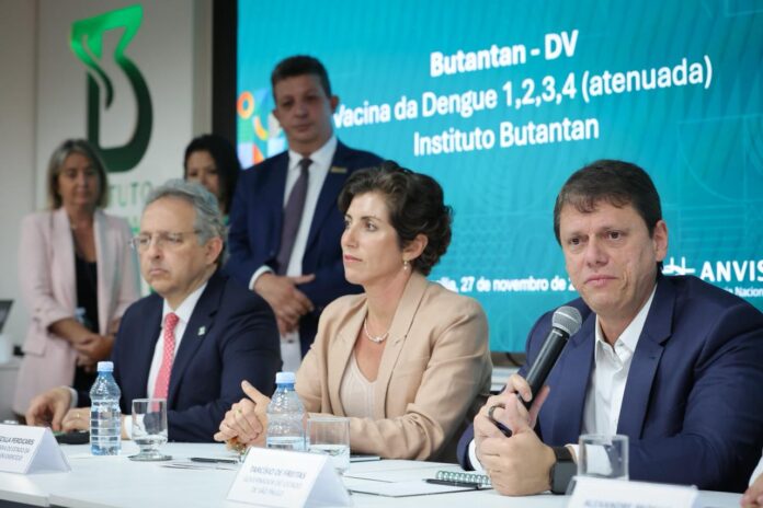 “A gente vem sofrendo muito com a dengue nos últimos anos e temos que celebrar a vacina brasileira. Por ser de dose única, vai nos ajudar muito na imunização, na cobertura vacinal. É a vitória da ciência, é a vitória da inovação, é a vitória do Butantan”, afirmou o governador Tarcísio de Freitas durante o evento que oficializou a aprovação ontem na sede do instituto, na capital.