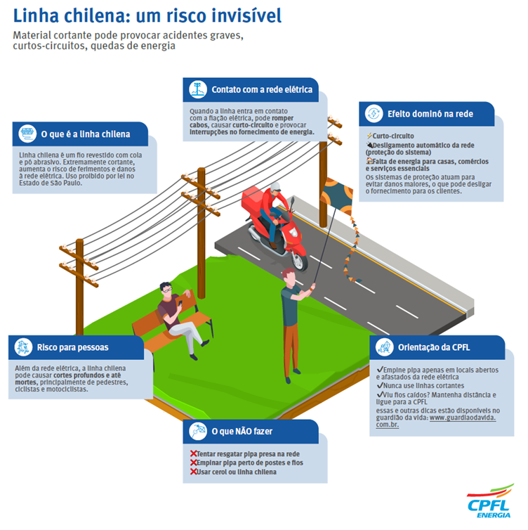 A CPFL orienta que a brincadeira aconteça apenas em locais abertos e afastados da rede elétrica, como parques e áreas descampadas. Empinar pipa em lajes, telhados, ruas ou próximo a postes representa risco iminente. Também não se deve, em hipótese alguma, tentar retirar pipas presas aos fios de energia.