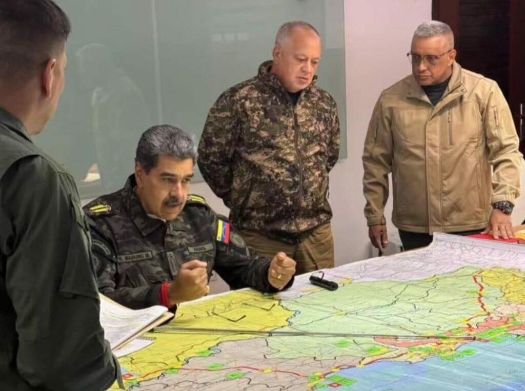 Trump avisando e o Nicolás Maduro proferindo bravatas. Discursou elogiando seu exército de velhinhos que usava espingarda de caçar passarinho; fez um pronunciamento pela TV dizendo onde estava e desafiando Trump a ir buscá-lo; e ironia das ironias, afirmou que contava com ajuda externa caso os americanos tentassem invadir sua plantação de maconha.