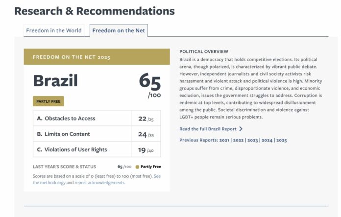 Relatório elaborado pela organização Freedom House atribuiu apenas 65 pontos (de 100) à liberdade para acessar e navegar a internet no Brasil. Segundo o estudo Freedom on the Net 2025, a quantidade de pessoas com acesso à web tem aumentado nos últimos anos no País, entretanto derrubam a nota brasileira o bloqueio de perfis de redes sociais pelo ministro do Supremo Tribunal Federal (STF) Alexandre de Moraes, citado no estudo, e outras punições contra jornalistas e usuários da internet.