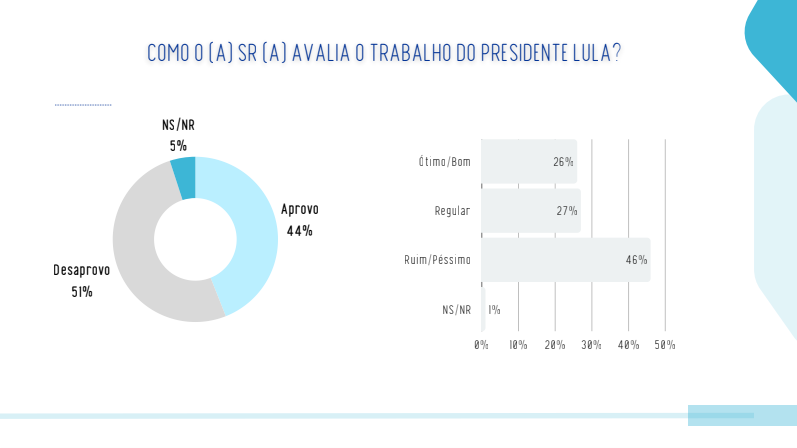 A pesquisa do instituto Real Time Big Data divulgada ontem (3) registra que o governo do presidente Lula (PT) é reprovado por 51% dos eleitores e tem somente 44% de aprovação. Para 46% dos 2 mil brasileiros entrevistados, o governo de Lula é avaliado como ruim ou péssimo.